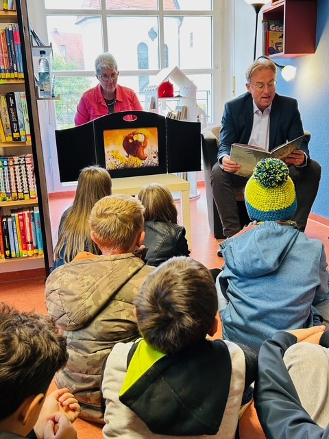 Der Bürgerbeauftragte der Bayerischen Staatsregierung war heute zu einer Lesung für Grundschüler in der Pfarrbücherei Oberndorf und hat das Bilderbuch von Katja Reider und Cornelia Haas „Bestimmer sein. Wie Elvis die Demokratie erfand“ (Hanser-Verlag) vorgelesen. Demokratie-Bildung geht bereits in der Grundschule los und die Zusammenhänge und Abläufe sollten rechtzeitig vermittelt werden: Es hat Herrn Fackler sehr viel Freude bereitet, den aufmerksamen Kindern die Demokratie einfach zu erklären: Wählen gehen, jede Stimme zählt. Was bedeutet Volksvertretung? Was ist Wahlkampf? Was bedeuten Verantwortung auf Zeit, Debatten und Kompromisse?